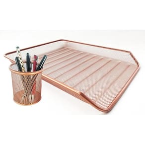 Kit Bandeja Organizadora E Porta Caneta De Escritório Rose Gold Essa maravilhosa bandeja organizadora multiuso de escritório e o porta caneta são ideais para você que procura praticidade para guarda e encontra canetas e papéis no seu dia a dia. Com eles você vai ganhar tempo e espaço, pois vai deixar a sua mesa de escritório ou escrivaninha sempre limpa e bem organizada, com tudo no seu devido lugar. Além é claro de dar mais sofisticação e elegância ao seu ambiente deixando ele com designer moderno. Você pode organizar e guardar documentos, papeis a4 e/ou sulfite, cadernos, livros, revistas, calculadoras, , arquivos e tudo o que mais desejar. É leve e prático de usar. Também pode guardar lápis e canetas. Cabe papel a4 e sulfite Características - bandejas/prateleiras - feito de metal - pintura resistente a risco - não necessita de montagem já vem pronta para usar Bandeja organizadora multiuso de mesa de escritório - cor: rose gold - material: metal - tamanho: 4x27,5x35cm altura x largura x comprimento - peso: 300gr Porta caneta, porta lápis - cor: rose gold - material: metal - tamanho: 9x10cm dxa - peso: 100gr Marca: Não Informado Ean: 7905802862395