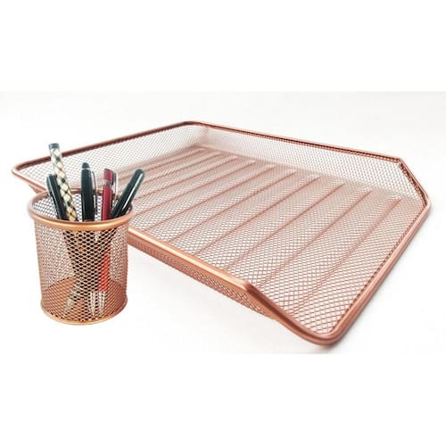 Kit Bandeja Organizadora E Porta Caneta De Escritório Rose Gold Essa maravilhosa bandeja organizadora multiuso de escritório e o porta caneta são ideais para você que procura praticidade para guarda e encontra canetas e papéis no seu dia a dia. Com eles você vai ganhar tempo e espaço, pois vai deixar a sua mesa de escritório ou escrivaninha sempre limpa e bem organizada, com tudo no seu devido lugar. Além é claro de dar mais sofisticação e elegância ao seu ambiente deixando ele com designer moderno. Você pode organizar e guardar documentos, papeis a4 e/ou sulfite, cadernos, livros, revistas, calculadoras, , arquivos e tudo o que mais desejar. É leve e prático de usar. Também pode guardar lápis e canetas. Cabe papel a4 e sulfite Características - bandejas/prateleiras - feito de metal - pintura resistente a risco - não necessita de montagem já vem pronta para usar Bandeja organizadora multiuso de mesa de escritório - cor: rose gold - material: metal - tamanho: 4x27,5x35cm altura x largura x comprimento - peso: 300gr Porta caneta, porta lápis - cor: rose gold - material: metal - tamanho: 9x10cm dxa - peso: 100gr Marca: Não Informado
