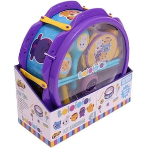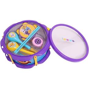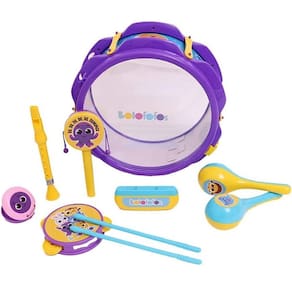 O kit é super completo, ele contém 1 castanhola, 1 par de baquetas, 1 par de chocalhos, 1 tambor com alça, 1 pandeirinho, 1 kabuletê, 1 gaita e 1 flauta. Com este conjunto, a criança não vai ficar parada!