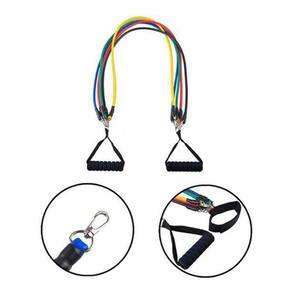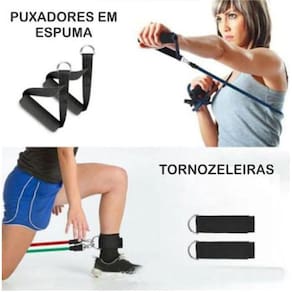 Kit tubing elástico 11 peças musculação treinamento funcional + mini band extra forte O pacote inclui: 1 elástico leve 1 elástico médio 1 elástico forte 1 elástico super forte 1 elástico extra forte 2 alças pegadores revestidos de espuma 2 tiras de tornozelos 1 ancora para travar na porta 1 bolsa de transporte em nylon Elásticos de duplo látex, é mais resistente e durabilidade Com este kit você faz praticamente todos exercícios que se faz numa academia, ótimo para iniciantes ou para suplementar os trabalhos já feitos em academia de pessoas com mais experiência. Alguns benefícios dos exercícios feitos com elásticos: A execução dos movimentos exige um maior reagrupamento de fibras musculares, o que resulta na queima de boa quantidade de calorias. Como todo exercício , auxilia na melhora do sistema circulatório, reduz os níveis de stress, melhora o sono e evita a obesidade. Gera fortalecimento muscular, tanto hipertrofia quanto maior resistência, resultando em consistentes melhoras no condicionamento físico e em maior resistência contra lesões. Os praticantes têm uma significativa melhora na coordenação motora, na mobilidade e apresentam maior flexibilidade. Pode ser utilizado para tratamentos físicos pós-cirúrgicos. Especificações: Elásticos feitos de borracha profissional látex de alta qualidade e resistência Cada elástico tem 1,20 mt de comprimento Facilmente você pode criar mais de 30 diferentes níveis de resistência, anexando 1, 2, 3, 4 ou 5 elásticos de uma vez. Perfeito para musculação, yoga e pilates etc