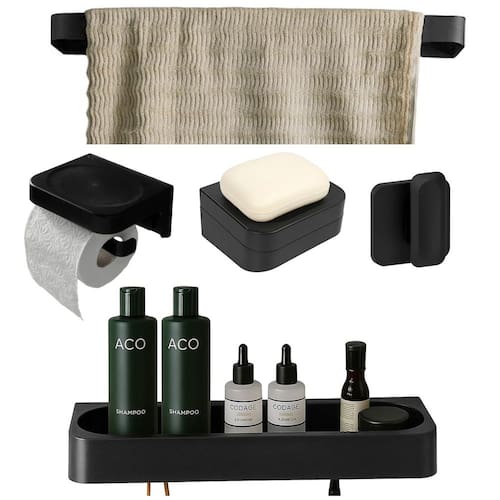 Kit Saboneteira + Suporte Papel Higiênico + Prateleira Porta Shampoo + Gancho Multiuso de Parede Com Adesivo Preto