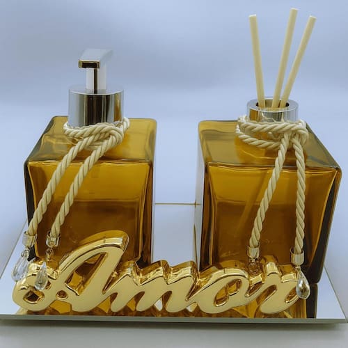 Kit Banheiro - Decoriatto O Kit Banheiro Decoriatto combina funcionalidade e sofisticação para deixar banheiros e lavabos mais elegantes. Com frascos de vidro branco fosco, acabamento prime e detalhes em corda, o conjunto é disposto sobre uma bandeja espelhada e acompanhado de mini suculenta artificial e palavra decorativa, criando um visual moderno e acolhedor. Composição: 1 Frasco saboneteira de vidro branco fosco com tampa Prime R28/410 e detalhe em corda decorativa. 1 Frasco difusor de vidro branco fosco com tampa Prime R28/410, varetas e detalhe em corda decorativa. 1 Bandeja espelhada retangular. 1 Mini suculenta artificial em vaso branco. 1 Palavra decorativa. Diferenciais: Design moderno e sofisticado. Ideal para presentear ou compor a decoração. Peças de alta qualidade. Marca: Não Informado