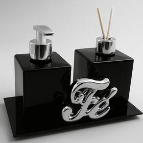 1 Frasco saboneteira de vidro branco fosco com tampa Prime 1 Frasco difusor de vidro branco fosco com tampa Prime e 3 varetas 1 Bandeja espelhada retangular. 1 Palavra decorativa.