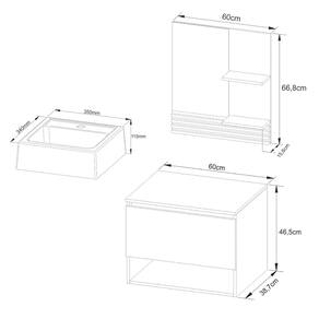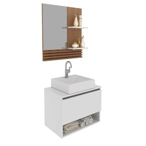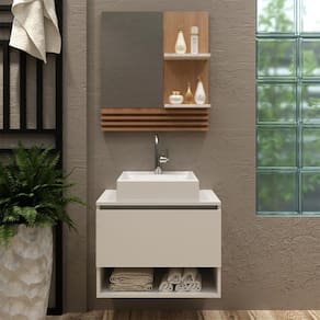 O Kit para Banheiro é a escolha ideal para dar um toque de elegância e organização ao seu espaço. Com um design contemporâneo, ele transforma o ambiente em um local mais convidativo e prático. Fabricado com materiais de alta qualidade, o kit oferece durabilidade e um visual sofisticado, tornando seu banheiro ainda mais funcional e bonito. CARACTERÍSTICAS TÉCNICAS: - Produzida em MDP de 15 mm - Acabamento UV na cor Branco, Amêndoa e Mármore Branco - Cuba em Mármore Sintético - Acompanha Espelho - Porta Basculante com Articulador e Dobradiças Metálicas - Puxador tipo Cava - Balcão Suspenso *Kit Composto por Gabinete Suspenso (3606), Espelheira (3614) e Cuba (3630) INFORMAÇÕES TÉCNICAS: 3606: Alt. 46,5 cm x Larg. 60 cm x Prof. 38,7 cm x P. 12 kg 3614: Alt. 44,7 cm x Larg. 60 cm x Prof. 38,7 cm x P. 12,65 kg 3630: Alt. 11,5 x Larg. 35 x Prof. 334 cm P. 5,5 kg INFORMAÇÕES ADICIONAIS: - ATENÇÃO: Não trabalhamos e não nos responsabilizamos pela montagem do móvel. Antes da montagem conferir se o produto está de acordo com o que comprou, produto montado e danificado pela montagem não será aceito troca. Montagem e instalação por conta do comprador. - As imagens ambientadas são meramente ilustrativas e podem apresentar itens que não compõe o produto. As cores do produto podem variar de acordo com o monitor, a iluminação do ambiente ou sua percepção visual. - Limpeza: Deve ser feita com pano macio e seco ou levemente umedecido com água e sabão neutro. Não devem ser utilizados abrasivos como palha de aço e objetos cortantes. -Garantia para defeitos de fabricação conforme Código de Defesa do Consumidor.