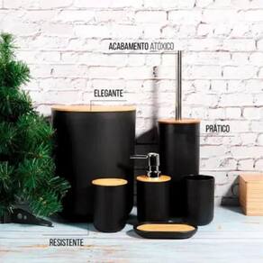 Kit Banheiro Com Tampa De Bambu Com 6 Peças Lixeira Fechada