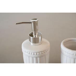 Nada melhor do que ter um banheiro organizado e com objetos proporcionando beleza ao ambiente não é mesmo Pensando nisso, a jolitex criou o kit banheiro branco em dois modelos diferentes para completar a decoração do seu banheiro. O kit possui 2 peças de cerâmica, sendo um dispenser para sabonete líquido e um pote para organização de itens da sua preferência, tornando o ambiente mais organizado e prático para o seu dia-a-dia e da sua família. A cor branca combina com qualquer decoração, além de dar um toque de requinte ao ambiente.