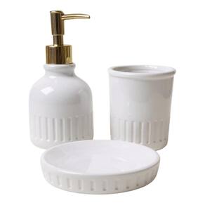 O kit contém: 1 Dispenser 9,2 cm x 17,5 cm , para sabonete líquido; 1 Saboneteira 13,5 x 9 x 3 cm , perfeita para sabonetes em barra; 1 Pote organizador 8,3 cm x 10,5 cm , ideal para escovas de dente.