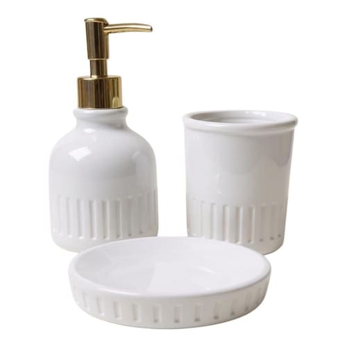 O kit contém: 1 Dispenser 9,2 cm x 17,5 cm , para sabonete líquido; 1 Saboneteira 13,5 x 9 x 3 cm , perfeita para sabonetes em barra; 1 Pote organizador 8,3 cm x 10,5 cm , ideal para escovas de dente.