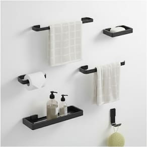 6 peças em aço preto: Porta toalha (45 cm), porta toalha rosto (22 cm), gancho, saboneteira, porta shampoo e porta papel higiênico.