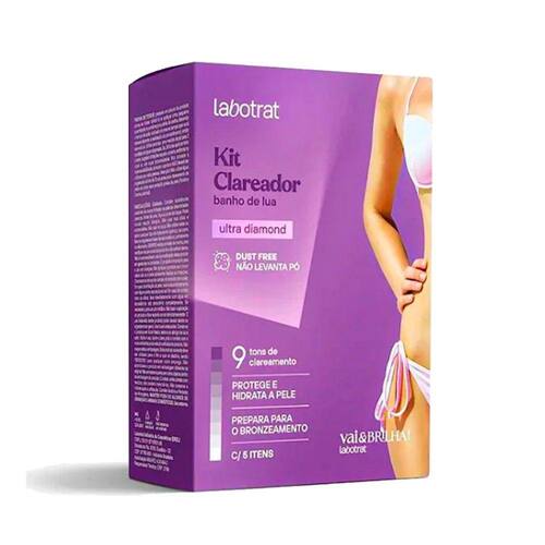 O kit contém:1- Parafina creme 20g1- Pó descolorante 30g1- Água oxigenada 30ml1- Esfoliante corporal 20g1- Hidratante de maracujá 20O Kit Claredor Banho De Lua Ultra Diamond Labotrat promove o clareamento rápido dos pelos em até 9 tons, limpa e remove as células mortas da pele, deixando-a macia e aveludada. De fácil aplicação e sem incômodo para a pele. Fórmula moderna, com efeito Dust Free ( não levanta pó ). Prepara a pele para um bronzeado perfeito. Uso corporal.Modo de usar:1- Proteção: Aplicar o creme de parafina Labotrat sobre a pele limpa, em toda a área onde for realizar a descoloração. Evita assim coceiras e ressecamento. Não retirar.2- Descoloração: Misturar 70ml de água oxigenada cremosa 30 volumes com 30g de pó descolorante Labotrat em recipiente não-metálico. Com um pincel, aplicar a mistura sobre os pelos e deixar agir de 15 a 30 minutos, conforme o grau para clarear desejado e a estrutura do pelo. Enxaguar bem. Com uso de sabonete, enxaguar bem.3- Esfoliação: Sobre a pele limpa, aplique o esfoliante corporal Labotrat com movimentos suaves. Enxaguar.
