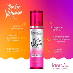 O Bye Bye Volume e No Frizz Liso Mágico 200ml é um spray alinhador dos fios que conta com proteção térmica. É ideal para a finalização de cabelos com excesso de volume e incômodo de frizz, já que forma uma película protetora contra a umidade. Seu previne pontas duplas, nutre, hidrata e proporciona brilho intenso.