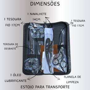 1 Tesoura fio laser 6 polegadas / 2cm Tomate 1 Teroura fio navalha 6 polegadas / 2cm Tomate 1 Teroura de desbaste / desfiadeira 6 polegadas / 2cm Tomate 1 Navalhete Tomate 1 Flanela de limpeza Tomate 1 Óleo lubrificante para as tesouras Tomate 1 Estojo para transporte Tomate