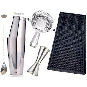 Kit composto Por 6 peças sendo: 1 Tin Copo Maior Coqueteleira Profissional Inox 820ml Barpro com peso 1 Mini Tin Copo Menor Coqueteleira profissional Inox 550ml Barpro com peso 1 Colher bailarina Disco 27cm 1 Dosador duplo Inox modelo Japones 1 Strainer Inox modelo Harwthorne com 4 apoios 1 Tapete escorredor Barmat 30x15cm