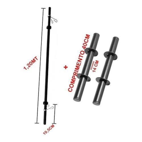 Kit Barra Body Pump + Par Barra Oca 40 Cm O kit é composto 1 Barra OCA 1,20 mt + 2 Presilhas A Barra OCA 1,20 m é ideal para os treinos em casa e na academia, produto de excelente qualidade e acabamento. Faça vários exercícios com esta excelente Barra , como bíceps, peito, glúteos, ombros, coxas, costas, agachamento e mais uma porção de variações. Com prático sistema de travas por presilhas permite trocas de anilhas mais rápidas Suporta aproximadamente 40 kg de anilhas Especificações Técnicas: - Barra Oca em aço - Feita em aço 1020 de 1 Polegada - Inclui limitador batedor de anilhas em PVC - Espessura parede do aço de 1,5 mm - Pintura eletrostática texturizada anti ferrugem - Acabamento das pontas em PVC - Presilhas de 3 voltas reforçada - Peso da Barra com presilhas 1,6 Kg ---------------------------------------------------------------------------------------------------- Barra Oca 40 cm Profissional Par - 2 Unidades + 4 unidades de Presilha A barra 40 cm Oca Com Presilhas é ideal para exercícios de peso livre e exercícios unilaterais. Com prático sistema de travas por presilhas permite trocas de pesos mais rápidas Suporta aproximadamente 60 kg de anilhas Especificações Técnicas: - Par de Barras Ocas em aço - Feita em aço 1020 de 1 Polegada - Espessura parede do aço de 2 mm - Pintura eletrostática texturizada anti ferrugem - Acabamento das pontas em PVC - Presilhas de 3 voltas reforçada - Suporta até 60 kg de anilhas total - Peso da Barra com presilhas 700 gramas