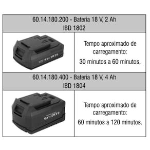 Kit composto de 1 Bateria 18V 4Ah DWT + 1 Carregador de Bateria DWT - Bateria 18V lítio 4 Ah IBD 1804 DWT linha intercambiável Bateria de íons de lítio, garantindo alta eficiência de operação. Possui indicador de nível de carga. Os três LEDs vermelhos indicam o status de carga da bateria. Um LED aceso: indica baixa carga; dois LEDs acesos: metade da carga; e três LEDs acesos: bateria carregada. Possui entrada de ar para sistema de refrigeração, base emborrachada que ajuda a prevenir riscos em superfícies e absorver impactos leves. Indicada para a linha de ferramentas a bateria intercambiável DWT. Carregadores indicados: carregador de bateria 18 V ICBD 1805 6014180500 ou carregador de bateria carga rápida 18 V ICBD 1806 6014180600 . Garantia legal: 90 dias + Garantia contratual: 9 meses DETALHES TÉCNICOS Modelo:ibd1804 Tipo de bateria:Íons de lítio Tensão V :18 V Capacidade da bateria A :4,0 Ah Indicador de bateria fraca:Sim Massa aproximada peso :0,71 kg- - Carregador de bateria DWT Carregador de bateria 18 V, linha intercambiável, carregamento convencional, ICBD 1805, DWT 1 Carregador de bateria. Bivolt automático. Indicado para carregar as baterias modelos IBD 1802 e IBD 1804, da linha intercambiável DWT. Tempo de carregamento aproximado : bateria de 2,0 Ah - 1 hora / bateria de 4,0 Ah - 2 horas. Carregador com carregamento convencional. Garantia legal: 90 dias + Garantia contratual: 9 meses Para locadoras, garantia única e exclusiva de 90 dias DETALHES TÉCNICOS Modelo:icbd 1805 Tensão de entrada do carregador de baterias:100 V - 240 V - Bivolt automático Frequência:50 Hz/60 Hz Tipo:carregamento convencional Tensão de saída do carregador de bateria:20 V Corrente de saída do carregador de bateria:2,3 A Tempo de carregamento:Bateria de 2.0ah - 60 minutos; Bateria de 4.0ah - 120 minutos Massa aproximada peso :0,444 kg