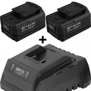 Kit composto de 2 Baterias 18V 4Ah DWT + 1 Carregador de Bateria DWT - Bateria 18V lítio 4 Ah IBD 1804 DWT linha intercambiável Bateria de íons de lítio, garantindo alta eficiência de operação. Possui indicador de nível de carga. Os três LEDs vermelhos indicam o status de carga da bateria. Um LED aceso: indica baixa carga; dois LEDs acesos: metade da carga; e três LEDs acesos: bateria carregada. Possui entrada de ar para sistema de refrigeração, base emborrachada que ajuda a prevenir riscos em superfícies e absorver impactos leves. Indicada para a linha de ferramentas a bateria intercambiável DWT. Carregadores indicados: carregador de bateria 18 V ICBD 1805 6014180500 ou carregador de bateria carga rápida 18 V ICBD 1806 6014180600 . legal: 90 dias + contratual: 9 meses DETALHES TÉCNICOS Modelo:ibd1804 Tipo de bateria:Íons de lítio Tensão V :18 V Capacidade da bateria A :4,0 Ah Indicador de bateria fraca:Sim Massa aproximada peso :0,71 kg- - Carregador de bateria DWT Carregador de bateria 18 V, linha intercambiável, carregamento convencional, ICBD 1805, DWT 1 Carregador de bateria. Bivolt automático. Indicado para carregar as baterias modelos IBD 1802 e IBD 1804, da linha intercambiável DWT. Tempo de carregamento aproximado : bateria de 2,0 Ah - 1 hora / bateria de 4,0 Ah - 2 horas. Carregador com carregamento convencional. legal: 90 dias + contratual: 9 meses Para locadoras, única e exclusiva de 90 dias DETALHES TÉCNICOS Modelo:icbd 1805 Tensão de entrada do carregador de baterias:100 V - 240 V - Bivolt automático Frequência:50 Hz/60 Hz Tipo:carregamento convencional Tensão de saída do carregador de bateria:20 V Corrente de saída do carregador de bateria:2,3 A Tempo de carregamento:Bateria de 2.0ah - 60 minutos; Bateria de 4.0ah - 120 minutos Massa aproximada peso :0,444 kg Marca: Não Informado