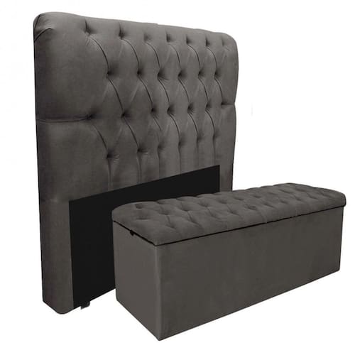 Lindo Conjunto Baú Recamier E Cabeceira Madrid Casal em Suede Cinza. Ideal para quem busca modernidade para o quarto e espaço para guardar cobertores, roupas de cama, travesseiros, entre outros. Recomendado para cama casal padrão 138cm x 188cm. Feitos com madeira reforçada 100% de reflorestamento garante durabilidade e a resistência do produto, acabamento em tecido Suede, tratamento antialérgico e antiácaro.