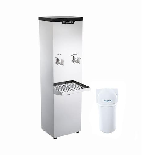 Modelo com 2 torneiras; Refrigeração através de gás refrigerante R-134a; Revestimento interno do tanque em polipropileno; Isolamento térmico em poliuretano injetado; Pia em aço inox 430, com dreno; Serpentina interna em aço inox 304; Acompanha filtro 5 e mangueira; Termostato com 7 níveis de regulagem; 4C no nível 7; Pés com regulagem de altura; Ideais para ambientes com grande circulação de pessoas; Fácil instalação; Revestimento externo em aço inox 430 brilhoso; Sistema: Compressor; Potência: 1/12 HP; Corrente: 1,2 A; Medidas totais: 130,5cm A x 36cm L x 51,5cm P. Filtro: 7 polegadas de altura na cor branca; Vazão nominal: 90 L/H; Pressão de operação: 19,6 a 392 kPa; Temperatura suportada: de 5C a 50C; Rosca da tampa: 1/2 polegada; Classe de retenção de partícula: Classe D; Vida útil do refil: Em torno de 4.000 L.Água gelada