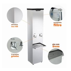 Especificações Bebedouro: - Modelo com 2 torneiras; - Revestimento interno do tanque em polipropileno; - Refrigeração através de gás refrigerante R-134a; - Isolamento térmico em poliuretano injetado; - Pia em aço inox 430, com dreno; - Serpentina interna em aço inox 304; - Acompanha filtro 5 e mangueira; - Termostato com 7 níveis de regulagem; - 4C no nível 7; - Pés com regulagem de altura; - Ideais para ambientes com grande circulação de pessoas; - Fácil instalação; - Revestimento externo em aço inox 430 brilhoso; - Tensão: 220V monofásico; - Sistema: Compressor; - Potência: 1/10HP; - Corrente: 2,1 A; - Medidas totais: 162,5cm A x 36cm L x 51,5cm P; - Medidas da embalagem: 178cm A x 47cm L x 46cm P; - Peso Líquido: 32kg; - Peso Bruto: 45kg;