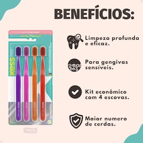 Este conjunto de quatro escovas garante que você tenha sempre à mão a ferramenta perfeita para uma escovação suave e eficiente, proporcionando uma sensação de frescor e limpeza duradoura. Invista na sua saúde bucal com a qualidade e a tecnologia que só a linha Kess Pro pode oferecer.