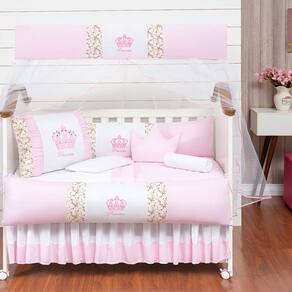Kit Protetor Berço Coroa Rosa 11 Peças Enxoval Menina
