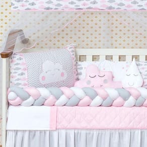 Kit Berço 11 Peças Nuvem Trançado Para Menina Rosa ClaroContém na embalagem:1 edredom 1,30 m x 0,75 cm1 almofada nuvem 0,40 cm x 0,20 cm1 cabeceira 0,57 cm x 0,37 cm1 lateral 1,25 m x 0,25 cm1 trança 1,25 m x 0,12 cm1 lençol de cima 1,30 m x 0,90 cm1 fronha 0,28 cm x 0,38 cm1 bandô de mosqueteiro 1,40 m x 0,20 cm1 mosqueteiro 4,50 m x 1,50 m1 almofada de gota1 saia box 1,30 m x 0,70 cm.Cor: Rosa ClaroObservação:Kit de berço que serve em berços padrão nacional e americanoPossui zíper para retirar os enchimentosTecido de qualidadeComposição:Tecido estampado: 100% algodãoTecido liso: 50% poliéster / 50% algodãoEnchimento = 100% poliésterMosquiteiro = 100% poliamida