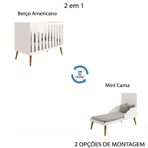 O berço que se transforma em mini cama acompanha o crescimento do bebê. Possui pintura UV de alta qualidade, 3 regulagens de altura no estrado e pés em madeira retrô.