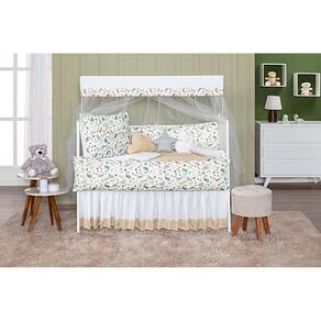 As peças que compõem o kit são: 1 cabeceira, 2 laterais, 1 lençol de cima, 1 fronha, 1 bando do mosquiteiro, 1 mosquiteiro, 1 almofada nuvem, 1 almofada gota, 1 almofada estrela, 1 trocador, 1 saia box e 1 edredom.