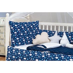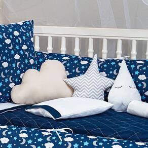 Kit berço menino lua marinho proteção em duas laterais 13p Kit berço 13 peças Contém: 1 cabeceira 0,60cm x 0,40cm.2 laterais 1,25m x 0,25cm.1 lençol de cima 1,30cm x 0,70cm.1 fronha 0,28cm x 0,38cm.1 bando do mosquiteiro 1,40m x 0,20cm.1 mosquiteiro 4,50m x 1,50m.1 almofada nuvem 0,40cm x 0,20cm.1 almofada gota 0,30cm x 0,22cm1 almofada estrela 0,30cm x 0,30cm.1 saia box 1,30m x 0,70cm x 0,30cm.1 edredom 1,30m x 0,75cm1 trocador 0,60cm x 0,42cm Descrição das pecas :Tecido estampado: 100% algodãoTecido liso: 50% algodão| 50% poliésterEnchimento 100% poliésterMosquiteiro 100% poliamida Informações importantes:O produto já vai pronto para o uso, com o enchimento já incluso.Acompanha as peças conforme a descrição, não esta incluso o berçoA cabeceira e as laterais do kit possuem zíper para retirar o enchimento,Facilitando assim uma possível lavagem do produto.