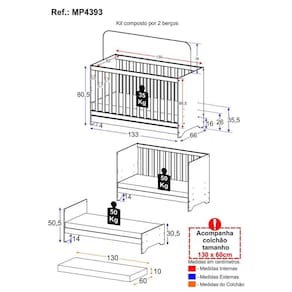 *O produto será entregue desmontado e não disponibilizamos o serviço de montagem. Acabamento: Pintura UV | Material: MDP | Referência do Modelo: MP4393 | Coleção: 3 em 1 | Instruções de Cuidado: Limpar com pano seco para retirar o pó. Não utilizar produtos químicos ou abrasivos a limpeza. Não aplicar lustra móveis. | Peso Suportado: 35 kg | Produto Composto Por: 2 berços, 2 colchões, manual de montagem e kit ferragem. | Sistema de Montagem: O produto acompanha manual de montagem juntamente com kit ferragem. O produto será entregue desmontado e não disponibilizamos o serviço de montagem. | Altura Montado: 80,5 | Largura Montado: 133 | Profundidade Montado: 66 | Tamanho (L x A x P): 133 x 81 x 66 | Peso do Produto: 45 | Vira Cama: Sim | Acompanha Colchão: Sim | Tamanho Colchão: 60 x 130 cm | Com gaveteiro: Não | Idade Mínima: 0 anos | Idade Máxima: 3 anos | Possui Rodízio: Não | Portátil: Não | RBN: 17352336011 | Tonalidade: Branco | Requer Montagem: Sim | Fabricante: Multimóveis | Garantia do Fabricante: 3 | Registro INMETRO: 000085/2018 | Altura (cm): 80,5 cm | Largura (cm): 133 cm | Profundidade (cm): 66 cm | Tipos de Madeira: MDP | Regulamentado pelo INMETRO: Sim | Altura do Produto com Embalagem: 39 | Largura do Produto com Embalagem: 75 | Comprimento do Produto com Embalagem: 135 | Peso do Produto com Embalagem: 45 | Estado de Origem: RS | Produto precisa de Montagem?: Sim, sugerimos a contratação do nosso serviço de montagem (para os CEPs em que o serviço está disponível) ou de algum profissional experiente de sua preferência | Nome do Produto no Fornecedor: Kit Berço para Gêmeos 3 em 1 com Colchões Inclusos Multimóveis MP4393 Branco | Descrição do Tamanho: (L x A x P): 133 x 81 x 66 cm | Tempo de Garantia: 3 meses | Destaque 1: Produzido em MDP: maior durabilidade e resistência. | Destaque 2: Certificado pelo INMETRO. Acompanha colchão. | Destaque 3: Tamanho do produto montado (L x A X P): 133 x 80,5 x 66 cm | Destaque 4: Berço 3 em 1: transforma-se em sofá e minicama, acompanhando o crescimento da criança. | Destaque 5: Kit com 2 berços: perfeito para irmãos gêmeos. | Tipo de Berço: Funcional | Quantidade de posições: 3 | Com muda-fraldas: Não | Com função co-sleeping: Não | Com grade removível: Não | Peso (kg): 45 kg | Idade recomendada: 0-24 meses | Marca: Multimóveis | Quantidade de caixas de embalagem: 02 | Baterias são necessárias?: Não | Certificação de teste externa: N/A | Is Fragile: Não | Dimensões do item P x L x A: length#value=66;length#unit=centimeters;width#value=133;width#unit=centimeters;height#value=80.5;height#unit=centimeters | Quantidade de itens: 1 | Peso do item: unit=kilograms;value=45 | Número da peça: MP4393.697 | Tamanho: Berço | Inclui manual de montagem: Sim | Tipo de Garantia: Garantia do Fabricante | Montagem: Necessita Montagem | País de Origem: Brasil | Palavras-chave: berco com colchao, berco pequeno bercos moveis, berco que vira cama, berco mini cama, berco, berço 3 em 1 bercos moveis, quarto completo de bebe, berco e guarda roupa, kit quarto bebe, quarto de bebe completo, quarto de bebe, quarto bebe, jogo de quarto bebe, quarto completo bebe, kit quarto bebe moveis, quarto infantil bebe, kit quarto de bebe | Componentes incluídos: Instrução de montagem Cor: Branco