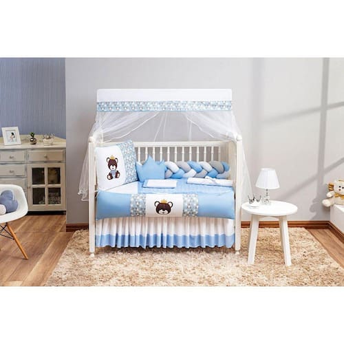 Kit Berço Principe Urso 11 Peças Azul Claro Com Trocador Total 11 peças 1 edredom 130cm x 75cm1 cabeceira 0.60 x 0.40 1 lateral 1.28 x 0.251 trança 1.28 x 0.12 1 fronha 0,28 x 0,38 1 lençol de cima com bainha1 bando do mosqueteiro 1.40 x 0.20 1 mosqueteiro 4.50 x 1.50 1 almofada 0.40 x 0.30 1 trocador 0,60 x 0,45 1 saia box 1,30 x 0,70 x 0,30 Composição: Tecido estampado: 100% algodão.Tecido colorido: 100% poliéster.Tecido lençol : 50% algodão 50% poliéster.Tule : 100% poliamida.Plástico: 100% PVC.Enchimento: 100% poliéster. Edredom dupla face todo matelado com várias costuras.Laterais e cabeceiras com zíper para facilitar a lavagem de seu produto.