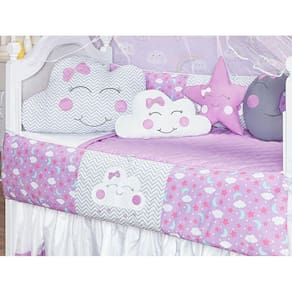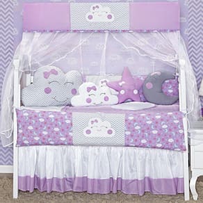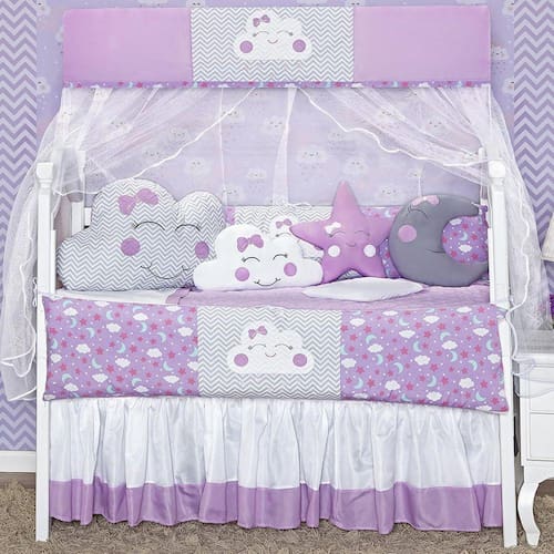Kit berço proteção duas laterais 12p formato nuvem lilás Kit berço nuvem 12 peças Atenção este é o melhor e mais completo kit berço do mercado Total 12 peças 1 cabeceira------------------0.60x0.40 mts 2 laterais -----------------------1.25x0.25mts 1 lençol de cima ------------1.30x0.70 mts 1 fronha ---------------------0.28x0.38 mts 1 bando do mosqueteiro---1.40x0.20 mts 1 mosqueteiro---------------4.50x1.50 mts 1 almofada nuvem --------0.40x0.20 mts 1 almofada lua ----------0,30 x 0,22 mts 1 almofada estrela---- 0,30 x 0,30 mts 1 saia box -------------1,30 x 0,70 x 0,30 mts 1 edredom--------------------130cm x 75cm Descrição das peças:Tecido estampado: 100% algodão Tecido liso: 50% algodão 50% poliésterEnchimento 100% poliésterMosqueteiro 100% poliamida Informações importantes:O produto já vai pronto para o uso, com o enchimento já incluso.Acompanha as peças conforme a descrição, não esta incluso o berçoA cabeceira e as laterais do kit possuem zíper para retirar o enchimento, facilitando assim uma possível lavagem do produto.
