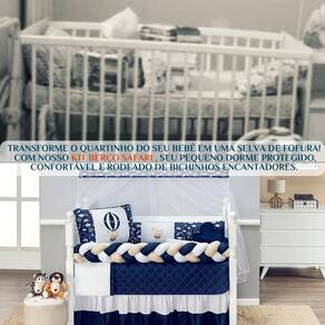 A chegada de um bebê muda tudo... E o quartinho precisa estar à altura desse momento mágico Esse kit berço foi pensado com muito carinho pra abraçar seu bebê com segurança, transformar o berço em um lugar aconchegante e ainda encher o ambiente de charme e alegria com a estampa safari marinho.