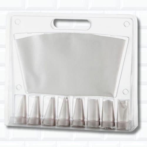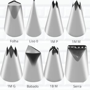 Kit confeiteiro com maleta, manga em silicone e 8 bicos em inox (crespo 1m, folha, liso 0, pitanga 1b, serra, babado pétala). Bicos grandes com emenda.Tipo