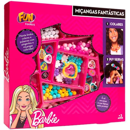 Kit Bijuterias Infantil - Barbie - Miçangas Fantásticas - Fun Divirta-se: as crianças ficam ainda mais fashions com as Miçangas Fantásticas da Barbie. Essa linha é um encanto. É possível criar diversas variações e opções de colares e pulseiras para ficar na moda. No melhor estilo “DIY (Do It Yourself - Faça Você Mesmo), as crianças podem criar seus próprios conjuntos de acessórios com pingentes e miçangas estampadas e coloridos. Acompanha diferentes estilos de pingentes e vários tipos de miçangas para arrasar no look. Arrase com as Miçangas Fantásticas da Barbie! Detalhes: • Você pode criar vários colares e pulseiras incríveis • Diferentes estilos de miçangas e pingentes estampados e coloridos • Crie diversos acessórios com a variação que Miçangas Fantásticas lhe entrega • É só encaixar e sua bijoux está pronta! Informações: • Produto: Miçangas Fantásticas • Marca: Fun Divirta-se • Coleção: Barbie • Tipo: Conjunto de bijuterias infantil • Categoria: Beleza e Moda Infantil • Conteúdo: Miçangas de plástico • Recomendação: para crianças a partir de 03 anos de idade Especificações: • Referência: F0085-5 • Código de Barras: 7908489401352 • Embalagem (C x A x L): 28 x 25 x 04 cm • Embalagem (Peso): 0.290 kg • Material / Composição: Plástico • Registro: CE-BRI/INNAC 02115-000 NM 300/2002 • Certificado: Órgãos Autorizados - OCP´S (Organismos de Certificação de Produtos) Benefícios de brincar: • Eleva a autoestima • Exercita a memória • Estimula o raciocínio • Exercita o imaginário • Desenvolve a criatividade • Desenvolve percepção visual • Desperta a atenção e curiosidade • Desenvolvimento neuropsicológico • Estimula habilidades motoras básicas • Incentiva a comunicação e linguagem • Desenvolve aspectos emocionais e afetivo • Estimula o reconhecimento de formas e cores Aviso: • As imagens são meramente ilustrativas • Os pesos, tamanhos e medidas são aproximados • As cores e estampas dos produtos podem ter variações • As informações são de responsabilidade do fabricante ou fornecedor Ean: 7908489401352