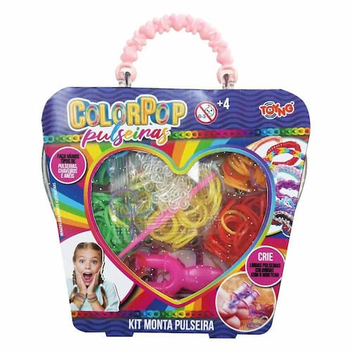 Kit Bijuterias Infantil - ColorPop Pulseiras - Estojo Coração - Toyng: as crianças ficam ainda mais fashions com ColorPop Pulseiras. É possível criar diversas variações e opções de pulseiras para ficar na moda. No melhor estilo “DIY (Do It Yourself - Faça Você Mesmo), as crianças podem criar seus próprios conjuntos de pulseiras de um jeito muito divertido. Detalhes: • Acompanha um mini tear para criar lindas pulseiras coloridas • Um kit completo para montar pulseiras • Tudo embalado em um lindo estojo de coração Informações: • Produto: Kit Monta Pulseira ColorPop Estojo Coração • Marca: Toyng • Linha: ColorPop Pulseiras • Tipo: Kit de Montar Pulseira Infantil • Categoria: Beleza e Moda Infantil • Conteúdo: - 01 tear pequeno - 01 agulha de crochê - 01 saco de clipes - 300 elásticos • Recomendação: para crianças a partir dos 04 anos de idade Especificações: • Referência: 50775 • Código de Barras: 7899871621383 • Embalagem (C x A x L): 13 x 14 x 03 cm • Embalagem (Peso): 0.098 kg • Material / Composição: • Material / Composição: - Pulseiras: 100% Borracha - Crochê e Tear: 100% Polipropileno - Clipes: 100% Poliestileno • Registro: 004549/2023 • Certificado: Órgãos Autorizados - OCP´S (Organismos de Certificação de Produtos) Aviso: • As imagens são meramente ilustrativas • Os pesos, tamanhos e medidas são aproximados • As cores e estampas dos produtos podem ter variações • As informações são de responsabilidade do fabricante ou fornecedor