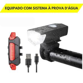 o kit de farol de bicicleta com lanterna traseira de led que estamos apresentando é uma escolha excelente para ciclistas que desejam uma opção durável, fácil de instalar e que forneça um brilho intenso em suas viagens de bicicleta. Este kit é projetado para oferecer uma iluminação excepcional durante passeios noturnos ou com pouca luz, permitindo que você pedale com segurança em condições de baixa visibilidade. Com a sua lanterna traseira de led, você pode garantir que outros ciclistas e motoristas possam ver você claramente, reduzindo o risco de acidentes. O kit é à prova d'água, o que significa que ele pode ser utilizado em condições climáticas adversas, sem danificar o produto. Isso garante que o kit possa ser utilizado com confiança em qualquer condição climática, sem comprometer a qualidade da iluminação. Além disso o farol é recarregava através de um simples cabo usb, ou seja, você pode garantir facilmente a iluminação da sua viagem, sem se preocupar com pilhas ou baterias. Também possui um poderoso led capaz de produzir 300 lumens. Sua bateria demora cerca de 3h para carregamento completo. A instalação deste kit é fácil e rápida, não exigindo ferramentas especiais ou conhecimento técnico avançado. O design compacto permite que você instale o farol e a lanterna traseira em segundos, sem comprometer o desempenho ou a estética da sua bicicleta. Em resumo, este kit de farol de bicicleta com lanterna traseira de led é a escolha ideal para ciclistas que buscam uma iluminação de alta qualidade, fácil instalação e durabilidade para todas as suas viagens de bicicleta. Garanta a sua segurança e visibilidade enquanto desfruta de suas aventuras de bicicleta com este kit de farol de bicicleta brilhante e eficiente. Características técnicas do kit