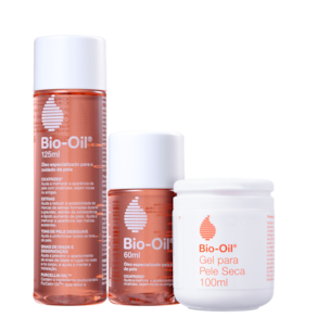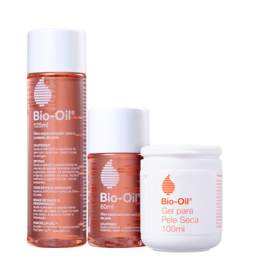 Kit Bio-Oil Óleo Restaurador & Gel Hidratante com 3 produtos que juntos melhoram a aparência da pele, protegem do ressecamento e hidratam fortemente. Além de repor a umidade da pele, devolvendo a flexibilidade.