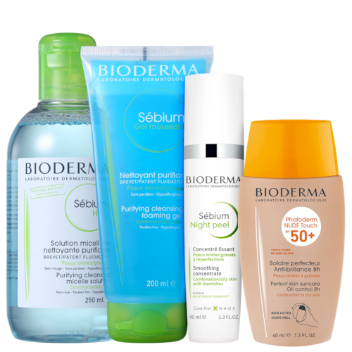 Kit com gel de limpeza, água micelar, protetor solar com cor e sérum. Kit Bioderma Sébium & Photoderm é ideal para peles mistas ou oleosas, promovendo um rosto mais limpo, hidratado, livre de acne e com a produção de sebo sob controle, além de assegurar efeito matificado.