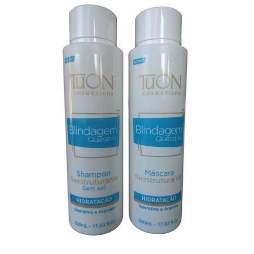 KIT BLINDAGEM QUERATRIX SHAMPOO E MÁSCARA - TUON - DESCRIÇÃO COMERCIAL: A Blindagem Queratrix consiste em um concentrado de proteínas que regenera profundamente a fibra capilar extra danificada por processos químicos, conferindo uma selagem natural das cutículas, reposição hídrica, aumentando a elasticidade, o brilho e a maciez dos cabelos. - DETALHE TÉCNICO: A Queratina Vegetal possui ação de reconstrução, fortalecimento e proteção nos cabelos, deixando os fios mais saudáveis, fortes e bonitos. Como ela atua na estrutura do fio, ajuda a fechar as cutículas e deixar o cabelo mais homogêneo e firme. A Arginina é um dos aminoácidos presentes na queratina, fortalece os fios e recupera os cabelos danificados, evitando a queda e a quebra capilar. Ela auxilia no crescimento, estimula a microcirculação, o que aumenta a nutrição do bulbo capilar e a troca de nutrientes entre a raiz e os fios, além de criar uma película protetora que reduz o ressecamento, especialmente nas pontas. - APLICAÇÃO: Shampoo: O Shampoo Reestruturante Hidratação Profunda possui propriedades suaves ao lavar os cabelos, promovendo hidratação, brilho e maleabilidade dos fios ao toque úmido. Desenvolvido a partir de ingredientes naturais, baseado no princípio da necessidade dos cabelos que necessitam de hidratação intensiva, o shampoo tem um equilíbrio de agentes que limpam suavemente e condicionam os fios, que promovem maciez aos cabelos, sem resseca-los, formando um filme de proteção que aumenta a durabilidade da cor. Não contém sal, parabenos, petrolatos ou silicones e não é testado em animais. Mascara: A Máscara Reestruturante Hidratação, possui propriedades altamente condicionantes, promove desembaraço instantâneo, hidratação, brilho e maleabilidade dos fios ao toque úmido e depois de seco. Desenvolvido a partir de ingredientes naturais, baseado no princípio da necessidade dos cabelos que necessitam de hidratação reposição de lipídios e água de dentro para fora, a Máscara tem um equilíbrio de agentes condicionam os fios e os protegem, formando um filme de proteção para melhorar a textura e elasticidade natural. O produto não contém Parabenos, Petrolatos ou Silicones, além de não ser testado em animais. - COMPOSIÇÃO: Shampoo: Aqua, Sodium Laureth Sulfate, Cocamide Dea, Cocamidopropyl Betaine, Glycerin, Guar Hydroxypropyltrimonium Chloride, Glycol Distearate, Citric Acid, Disodium Edta, Polyquaternium-10, Simmondsia Chinensis Seed Oil, Ricinus Communis (Castor) Seed Oil, Phenoxyethanol, Peg-150 Distearate, Parfum, Benzyl Alcohol. Máscara: Aqua, Behentrimonium Chloride, Cetearyl Alcohol, Cetrimonium Chloride, Polyquaternium-10, Simmondsia Chinensis Seed Oil, Ricinus Communis (Castor) Seed Oil, Citric Acid, Disodium Edta, Parfum, Benzyl Alcohol. Modelador: Aqua, Behentrimonium Chloride, Cetearyl Alcohol, Cetrimonium Chloride, Polyquaternium-10, Simmondsia Chinensis Seed Oil, Ricinus Communis (Castor) Seed Oil, Citric Acid, Disodium Edta, Parfum, Benzyl Alcohol. Mascara - GARANTIA: 3 meses de garantia, contra defeitos de fabricação. - MODO DE USAR: Shampoo: Aplique o Shampoo Ativador de Cachos nos cabelos úmidos, massageando suavemente até obter uma espuma cremosa. Deixe agir por 3 minutos e enxágue bem. Em seguida, aplique a Máscara Ativadora de Cachos.". Máscara: Após a higienização com o Shampoo Ativador de Cachos, aplique a Máscara Ativadora de Cachos nos cabelos úmidos, enluve delicadamente os fios. Deixe agir por 10 minutos e enxágue bem. Modelador: 1° passo: depois de lavar os cabelos, aplique o Modelador Ativador de Cachos e desembarace os fios; 2° passo: divida os fios em quatro partes e aplique o produto em cada mecha. 3° passo: para finalizar, realize uma fitagem nos cachos para garantir uma boa definição. Mascara: Aplique o Shampoo Reestruturante nos cabelos molhados, massageando delicadamente até obter uma espuma cremosa. Deixe agir por alguns minutos e enxágue bem. - CUIDADOS: Manter fora do alcance de crianças. Em caso de contato com os olhos lave com água em abundância. - CONTEÚDO EMBALAGEM: 1 Shampoo 500ml + 1 Mascara 500ml - FICHA TÉCNICA: CÓDIGO INTERNO (SKU): 100005 - TIPO: Kit Blindagem Queratrix - CARACTERÍSTICA: Shampoo e Máscara - UNIDADE VENDA: Un - MARCA: Tuon - TIPO CABELO: Cabelos ressecados e opacos que sofrem com a ação de químicas agressivas e falta de hidratação. - TIPO TEXTURA: Ressecados sem brilho - TIPO TRATAMENTO: Hidratação Profunda - RECUPERADOR FIOS: Sim - REDUTOR FRIZZ: Sim - REMOVEDOR PONTAS DUPLAS: Sim - EFEITO: Hidratação profunda - NCM: 33051000 - ORIGEM PRODUTO: Nacional - CATEGORIA: Blindagem Capilar - TIPO EMBALAGEM: Caixa - Dimensões Embalagem (AxLxC): 22x6x18cm - PESO: 1Kg - VOLUMES: 1 - EAN / GTIN: 7890361000053