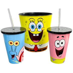 Kit Bob Esponja Almofada Suede Balde Pipoca + Copos Oficial