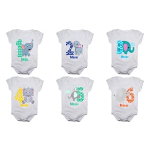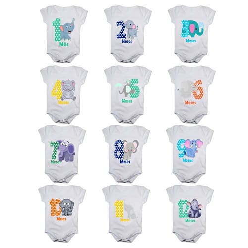 Kit body bebê mesversario manga curta estampa elefantinhos 12 bodies 1 a 12 meses - Único - Branco