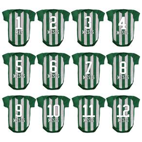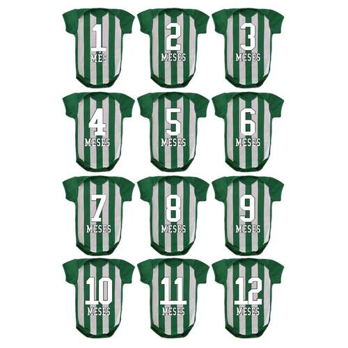 Body de bebê mesversario - kit com 12 peças Tecido frente: 96% poliéster, 04% elastano. Tecido costas e mangas: 100% algodão. Cor: Verde/Branco. Toque macio e confortável. Estampa sublimada de alta qualidade. Tamanhos: 1 a 2 meses P / 3 a 5 meses M / 6 a 8 meses G / 9 a 12 meses GG.