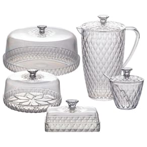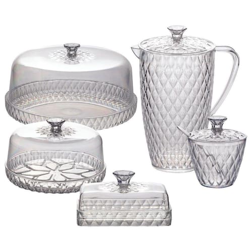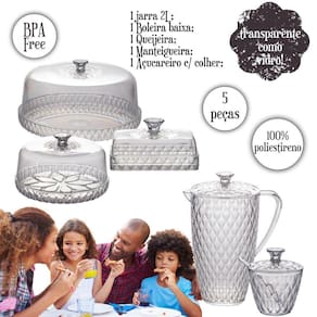 Kit café da manhã e chá da tarde composto por 1 boleira/porta bolo, 1 queijeira/porta queijo, 1 manteigueira/porta manteiga, 1 açucareiro/porta açúcar com colher e 1 jarra de 2L;Os produtos são fabricados em plástico cristal e têm aparência de vidro, sendo o kit composto da seguinte forma:1 Boleira;Material: poliestirenoDimensões: 26cmX26cmX14cm (CxLxA)Medidas INTERNAS: 25cm X 10cm (diâmetro X altura)1 Queijeira;Material: poliestirenoDimensões: 18cmX18cmX11cm (CxLxA)Medidas INTERNAS: 17cm X 7cm (diâmetro X altura)1 Manteigueira;Material: poliestirenoDimensões: 14,5cmX8,3cmX7,4cm (CxLxA)1 Açucareiro com colher;Material: poliestirenoDimensões: 11,5cmX9,8cmX11,1cm (CxLxA)1 Jarra de 2L;Material: PoliestirenoDimensões: 19,2cmX13,5cmX25,4cm (CxLxA)- Todas as peças deste kit são fabricadas em poliestireno de altíssima qualidade;- Aparência de vidro;- Idêntico ao acrílico;- Material leve e resistente a riscos;- Produtos com toque refinado;- Livres de BPA - BPA Free (não contém bisfenol em sua composição);- Todos os itens do kit são no mesmo tom de transparência e se combinam perfeitamente entre eles;- Kit mais do que exclusivo para quem está montando a casa;- Presente diferenciado e ideal para chá de cozinha;- Fabricante Plasútil;