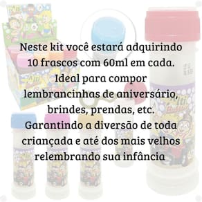 - Lembrancinha perfeita para sua festa. - Produto devidamente registrado no INMETRO. - No pote cabe de 50ml a 60 ml de sabão e já contem liquido para fazer bolhas. - Medidas aproximadas: 10 x 3,5 cm cada unidade. - As crianças AMAM as bolhas de sabão, faça a alegria das crianças sem gastar muito. - Material é de qualidade. - Idade mínima recomendada: 3 anos. - Não utiliza pilha e nem bateria. - Lembrancinha perfeita para festas infantis e dias de lazer.