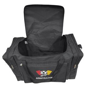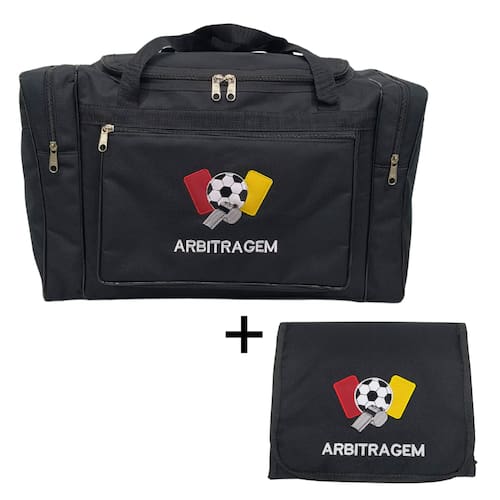 Seu interior espaçoso comporta com facilidade uniformes, chuteiras, apitos, cronômetro e demais acessórios. A mala conta com um compartimento principal amplo, dois bolsos laterais e um bolso frontal, todos com fechamento em zíper, garantindo segurança e praticidade no acesso aos objetos. Conta com alça de mão e alça transversal removível para facilitar o transporte.