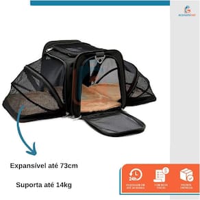- Bolsa expansível para que seu pet tenha mais espaço; - Confeccionada nas especificações para embarque na cabine de aviões da maioria das companhias aéreas; - Acomoda confortavelmente pets de até 14kg; - Aberturas frontal e lateral que facilitam a entrada e saída do pet; - Fundo interno rígido removível, fácil de higienizar; - Alta qualidade de fabricação e detalhe; - Super arejada, confeccionada com tela de alta resistência nas laterais e topo; - Totalmente dobrável e fácil de guardar.