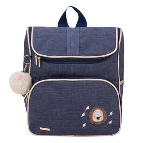 Mochila possui alças de costas e bolso frontal com fechamento em zíper