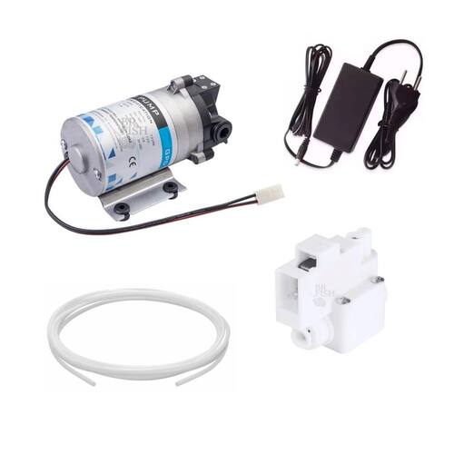 Kit para pressurizar purificadores e bebedouros de água, quando se tem baixa pressão. Acompanha: 1x bomba pressurizadora + fonte bivolt 1x pressostato 2x conectores cotovelos para mangueira de 1/4 2 metros de mangueira branca 1/4 ///modelo da bomba pode variar de acordo com disponibilidade em /// Marca: Não Informado