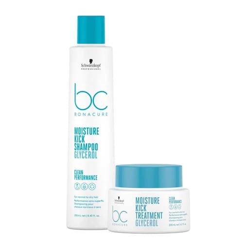Kit com shampoo e máscara para todos os tipos de cabelo. Schwarzkopf Professional BC Bonacure Clean Performance Moisture Kick Duo Super oferece tratamento em profundidade e suavidade aos fios.
